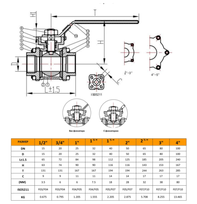 конструкция — муфтовый, (Вр/Вр), резьба внутренняя, трехсоставной, разборный, с блокировкой ручки;